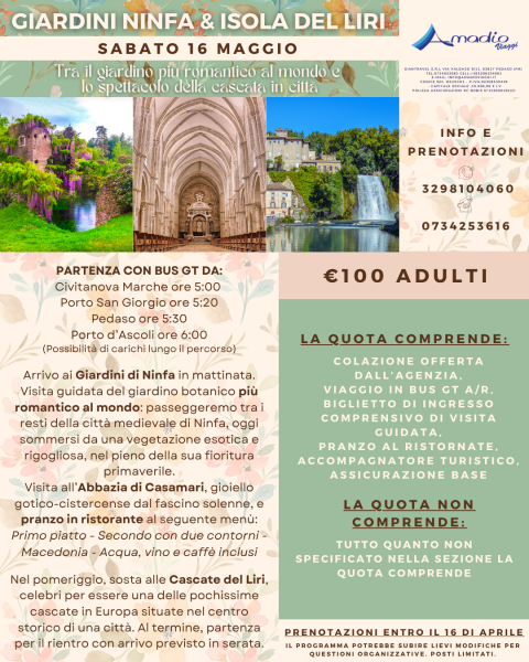 Vieni con noi Sabato 16 Maggio – Giardini di Ninfa e Isola del Liri Tra il giardino più romantico al mondo ..