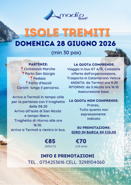 VIENI CON NOI ALLE ISOLE TREMITI - DOMENICA 28 GIUGNO 2026 Raggiungeremo Termoli in bus e da lì ci imbarcheremo per ..