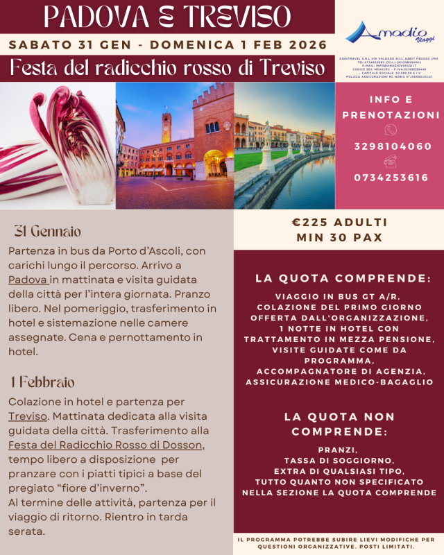 Un fine settimana tra arte, cultura e tradizioni enogastronomiche. La prima giornata sarà dedicata alla scoperta di Padova con visita guidata dell’intera città. Il giorno seguente visiteremo Treviso e parteciperemo alla 39ª Festa del Radicchio Rosso di Dosson, occasione ideale per degustare i piatti tipici a base del celebre “fiore d’inverno”.