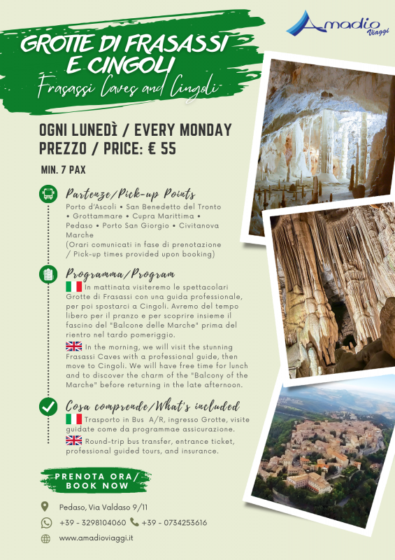 • Lunedì – Grotte di Frasassi e Cingoli (€55): Immergiti nello spettacolo sotterraneo delle grotte e goditi la vista dal "Balcone delle Marche".