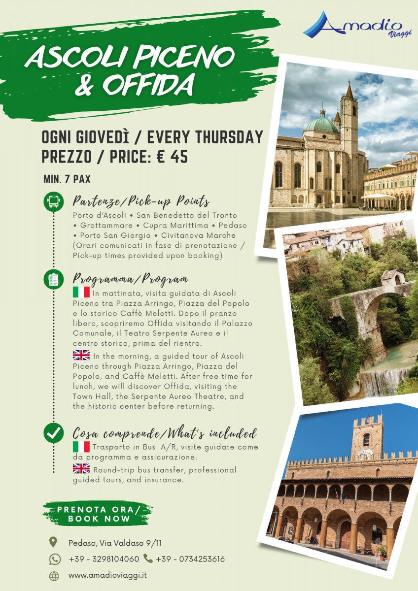 La giornata inizia ad Ascoli Piceno, la "Città delle Cento Torri", dove il travertino riveste ogni angolo del centro storico rendendolo unico al mondo. La nostra guida vi condurrà tra i "due cuori" cittadini: Piazza Arringo, sede del potere spirituale, e Piazza del Popolo, considerata tra le piazze più eleganti d'Europa. Ammireremo la Chiesa di San Francesco e lo storico Caffè Meletti, prima di lasciarvi del tempo per il pranzo, occasione ideale per assaggiare le autentiche olive ascolane.