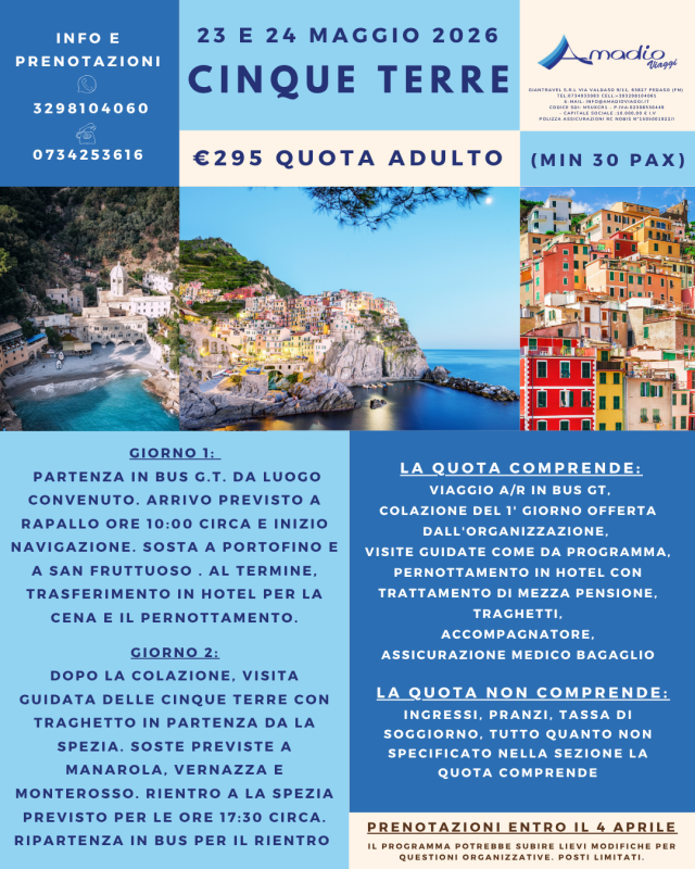 Giorno 2: Dopo la colazione, ci aspetta la magia delle Cinque Terre! Partiremo da La Spezia in traghetto per ammirare dal mare Manarola, Vernazza e Monterosso. Una giornata dedicata ai vicoli liguri e ai panorami mozzafiato prima del rientro previsto in serata.