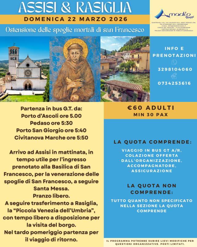 La giornata prevede l’arrivo ad Assisi in mattinata con ingresso prenotato alla Basilica di San Francesco: venerazione delle sacre spoglie presso la Basilica Inferiore e, a seguire, partecipazione alla Santa Messa nella Basilica Superiore. Pranzo libero