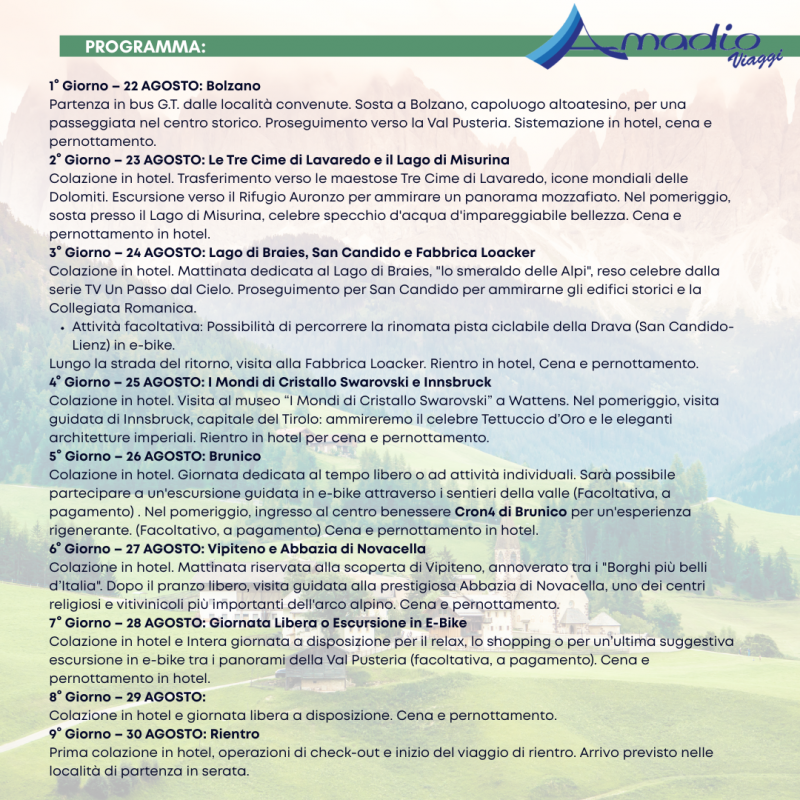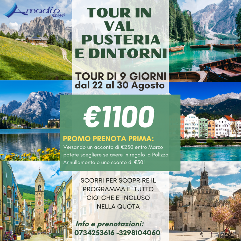 Soggiorna 8 in mezza pensione in Val Pusteria, e lasciati conquistare dalla bellezza dei luoghi che abbiamo selezionato per le escursioni: Bolzano, Le tre cime di Lavaredo, Il Lago di Braies, San Candido, Innsbruck, Brunico, Vipiteno, L'abbazia di Novacella e molto altro!